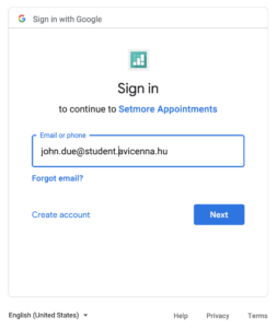 On the next window, you should type your college email (yourfirstname.yourlastname@student.avicenna.hu) and click on the “next” button to type your password. In case you do not have a college email you can log in with your personal Gmail account.