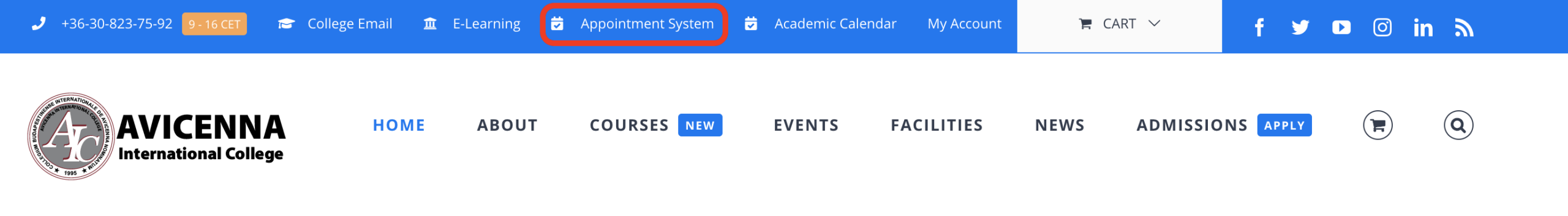 Open your browser and enter the Avicenna website URL in your address bar. From the top menu click on Appointment System.