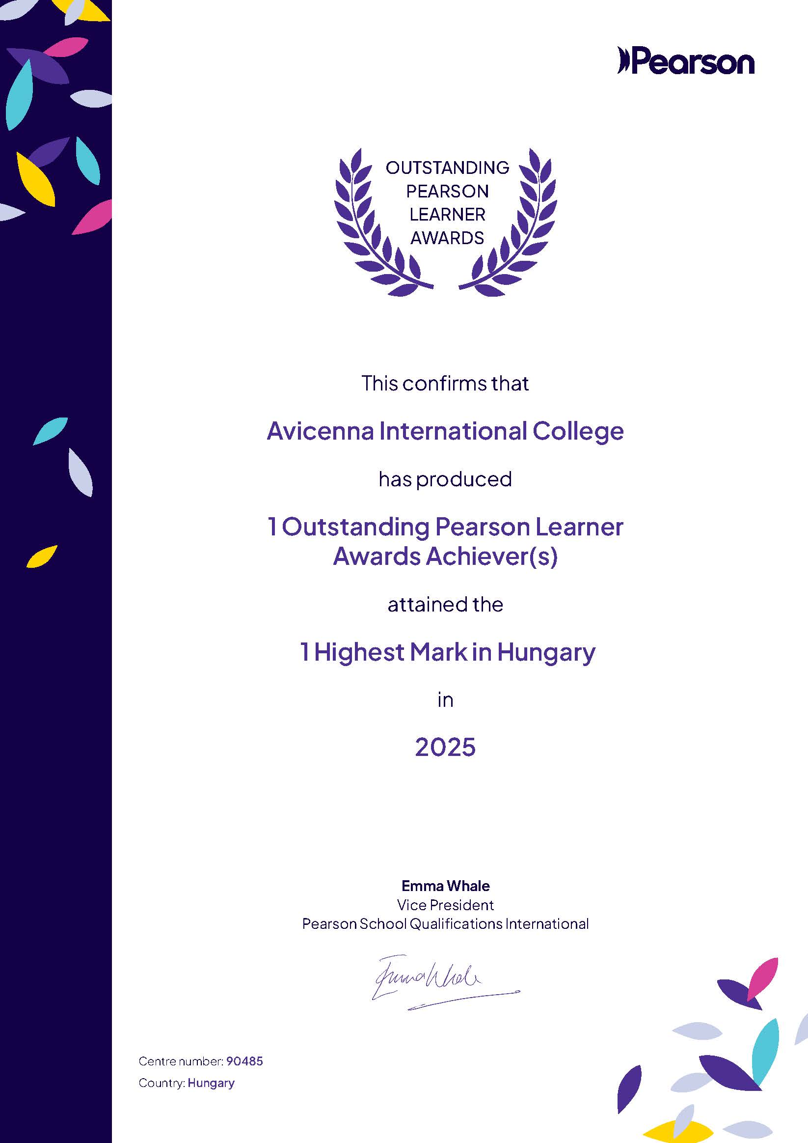 09. Dec. 2025 We extend heartfelt congratulations to Panni Csoka from Avicenna International College for attaining the Highest Mark in Hungary in the Pearson Edexcel International GCSE in Science (Double Award)! 09. Dec. 2025