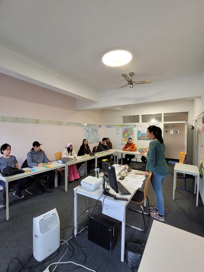 At our partner school, the Dialoge Bodensee Sprachschule, our students attended German language classes every morning divided in three different groups ( A1, A2, B2), from 9 am to 12.30 pm. The school is very well equipped with the latest IT technology spaced out in every classroom. The rooms are spacious and bright, having a maximum capacity of 20 students each. In the middle of the building, there is a large lobby area where our students could mingle with students from other countries. It opens into an equally large terrace which gives a spectacular view to the nearby lake Boden (Bodensee).