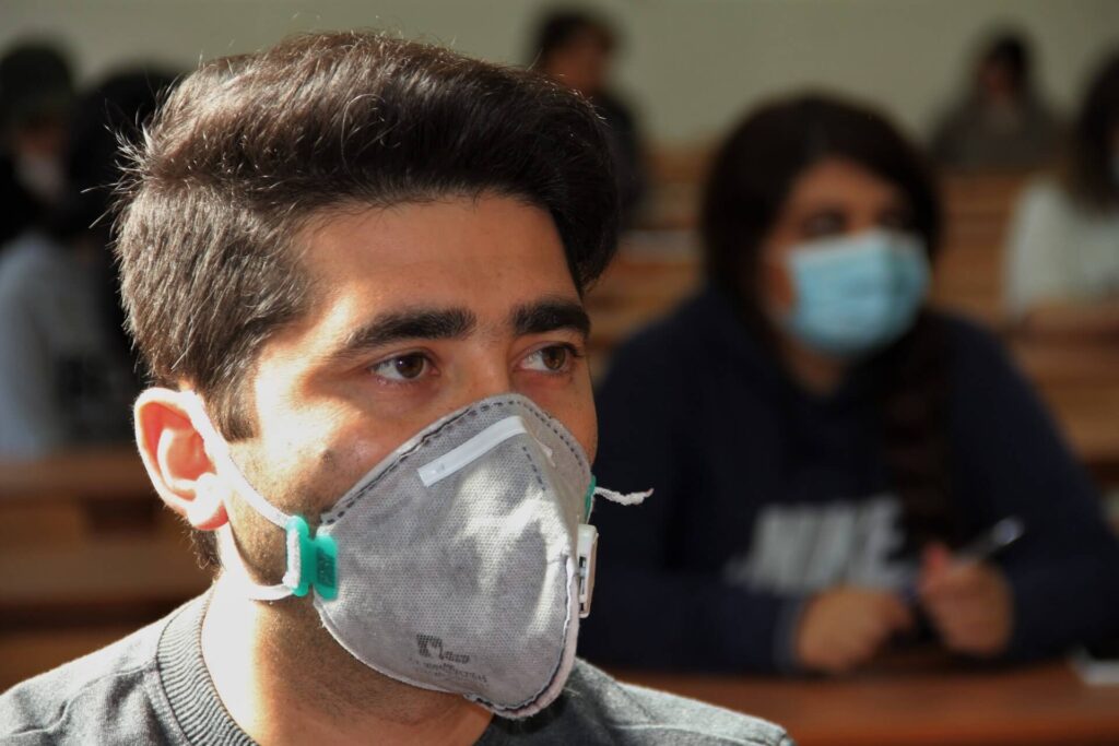The final exam of the German language course at Avicenna International College on 27. May 2020. Students and teachers take precautions against Coronavirus. Abschlussprüfung des Deutschkurses in Avicenna International College am 27. Mai 2020. Die StudentInnen und LehrerInnen nehmen Vorsichtsmaßnahmen gegen Coronavirus.